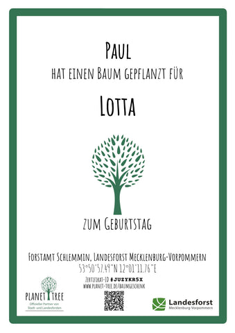 Du kannst das Geschenk ohne oder optional mit Baumpflanzung (+10,00 Euro, beinhaltet Zertifikat, Etikett und weitere Dokumente) in einem deutschen Landes- oder Kommunalforst kaufen.