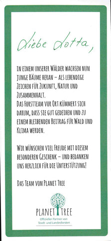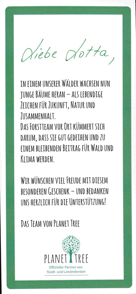 Zu jedem Geschenk oder Zertifikat pflanzen wir optional einen Baum – im Namen der beschenkten Person. Gepflanzt wird in Deutschland, in Landes- und Kommunalforsten.