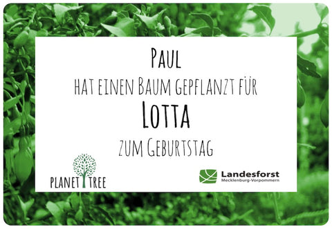 Du kannst das Geschenk ohne oder optional mit Baumpflanzung (+10,00 Euro, beinhaltet Zertifikat, Etikett und weitere Dokumente) in einem deutschen Landes- oder Kommunalforst kaufen.
