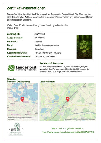Du kannst das Geschenk ohne oder optional mit Baumpflanzung (+10,00 Euro, beinhaltet Zertifikat, Etikett und weitere Dokumente) in einem deutschen Landes- oder Kommunalforst kaufen.