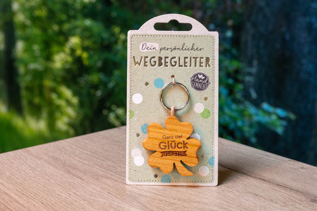 - Kleeblatt aus Kirschholz mit Schlüsselring aus Metall