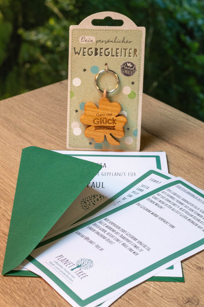 Ein von Dir weiter oben personalisiertes Zertifikat über die Baumpflanzung wird dem Geschenk im DIN A5-Format in einem dunkelgrünen Umschlag beigelegt, außerdem ein Begleitblatt mit persönlicher Anrede sowie eine Information zum Geschenk.
